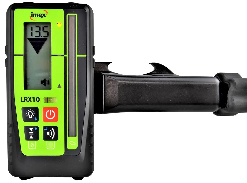 - Le récepteur laser LRX10 d”Imex fournit des niveaux avec une précision de 0,5 mm et détecte les lignes laser rouges et vertes.
